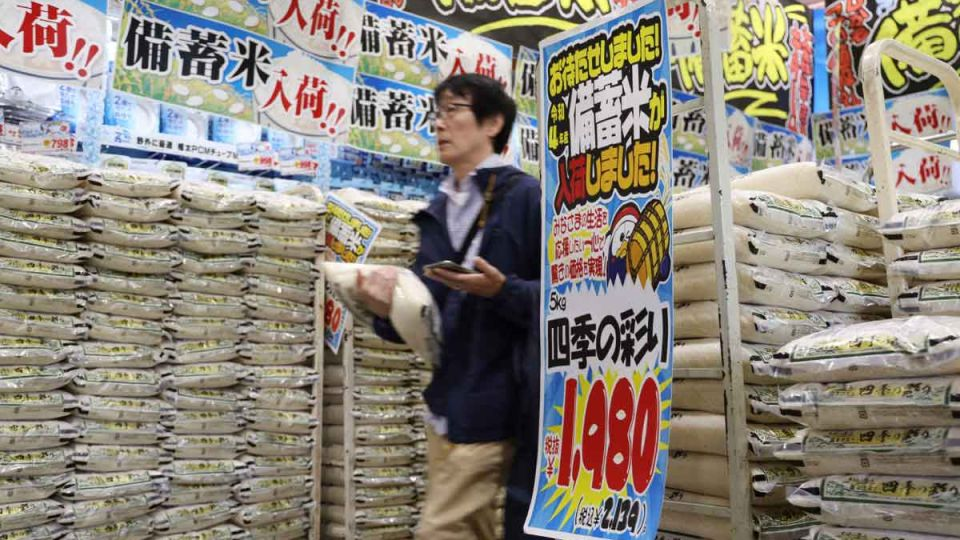 A customer walks past sacks of rice, released by the government from its reserve under a discretionary contract, at a branch of Japanese discount retailer Don Quijote in Tokyo on June 1, 2025. PHOTO: JIJI PRESS/AFP.