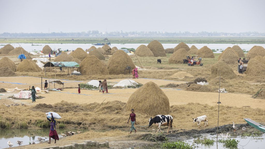 Farmers and their families dry freshly threshed Boro paddy on low-lying land in Mithamoin upazila, Kishoreganj. They report a bountiful harvest this year and are racing against time to dry the paddy before monsoon sets in and floods the plains. Photo: Rajib Dhar/TBS.