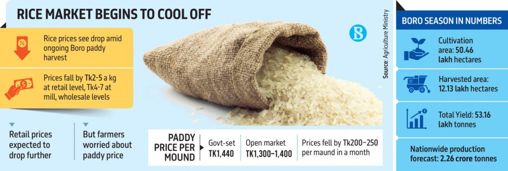 Within a week, rice prices have dropped by Tk2–5 per kg at the retail level and Tk4-7 at mill and wholesale levels. Prices are expected to fall further as more Boro paddy enters the market, traders said.