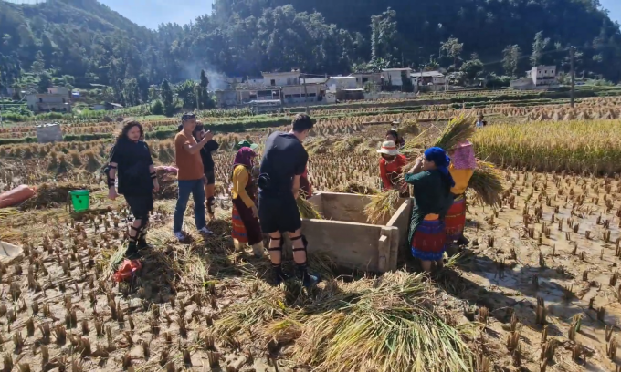 In the video, seven foreign tourists were seen standing in a rice field in Lung Cu District. Some held large bundles of freshly cut rice, while others helped local women thresh rice, a process of loosening the edible part of the rice from the chaff to which it is attached.