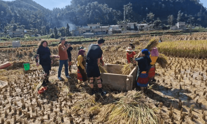 Dao Minh Tuan, a freelance tour guide in Ha Giang, has been taking foreign tourists to experience local culture and daily life since 2023. In October, he guided a group from the U.K., Poland, and New Zealand on a two-week trip to Ha Giang. Their itinerary included supporting an English-teaching club and assisting locals with rice harvesting.