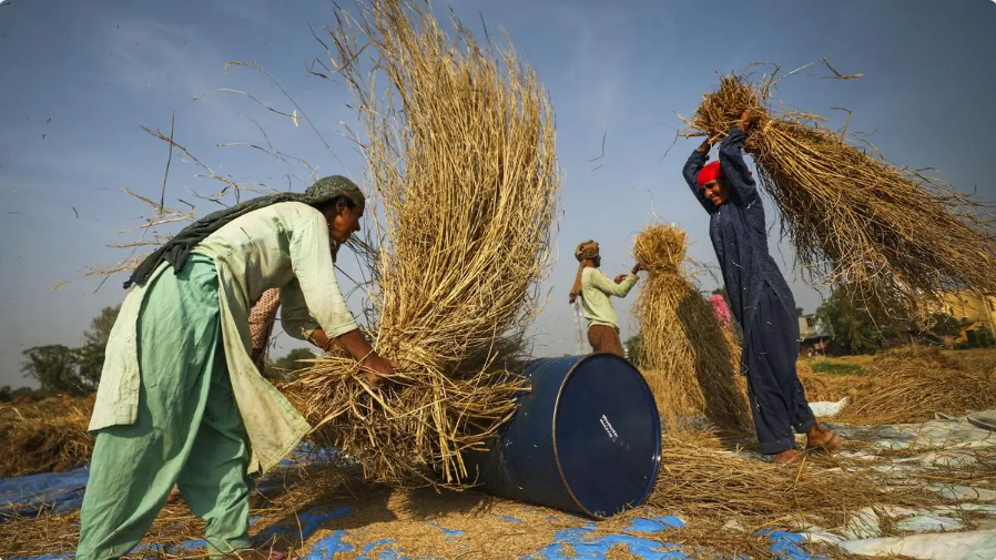 Jammu: Farmers thrash paddy plants to separate the rice grain, on the outskirts of Jammu