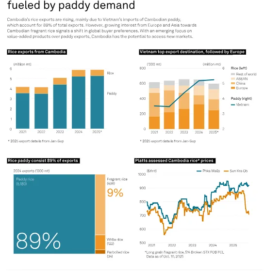 In 2024, Cambodian rice exports rose 14% year over year, primarily fueled by a significant rise in paddy exports to Vietnam, which accounted for 89% of total exports, highlighting Cambodia’s reliance on this sector.