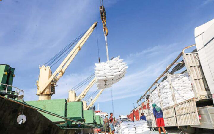 Export rice bags are being loaded onto the overseas-bound merchant vessel.