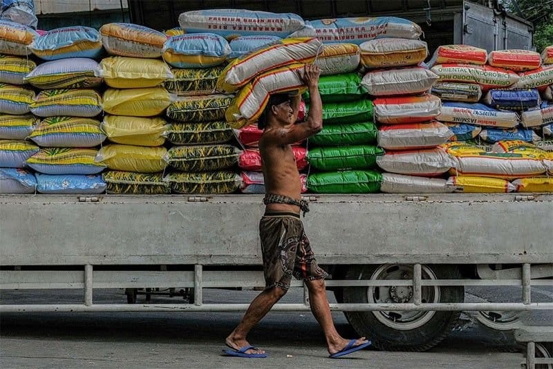 Workers unload sacks of rice along Dagupan Street in Manila on February 27, 2025.