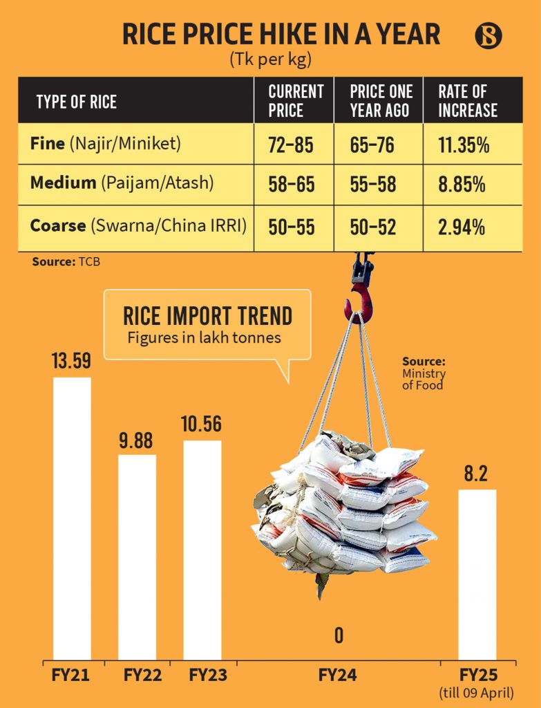 However, importers argue that high global prices are limiting the impact of imports on local markets. Chitta Majumder, a rice importer and miller, said, “There’s no profit in importing rice. Swarna costs about Tk50–51 per kg to import, and with added expenses, it’s not viable – especially for medium or coarse rice.”
