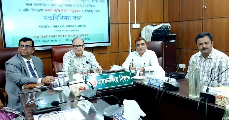 Divisional Commissioner Mokhtar Ahmed presided over the meeting. Additional Divisional Commissioner Tahmina Akhter, Mymensingh Deputy Commissioner Mufidul Alam, Sherpur Deputy Commissioner Tarafdar Mahmudur Rahman, Jamalpur Deputy Commissioner Hasina Begum, Netrokona Deputy Commissioner Banani Biswas, Regional Food Officer Abu Naeem Md. Shafiul Alam, Mymensingh District Food Officer Md. Abdul Quader, Sherpur District Food Officer Md. Nazmul Haque Bhuiyan, Jamalpur Food Officer Md. Asaduzzaman Khan, and Netrokona Food Officer Md. Moetachemur Rahman, among others, were present.