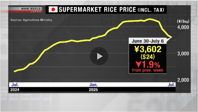 The average price of rice at supermarkets in Japan has fallen for a seventh straight week. Yet it remains higher than a year ago.